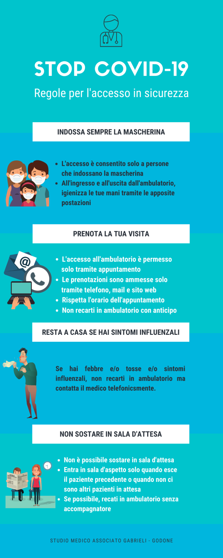 Si raccomanda di non accedere allo studio del medico di famiglia (e alle altre strutture sanitarie) per problemi minori che possono essere rimandati a tempi successivi: non possiamo permetterci una sala di attesa con persone a distanza ravvicinata.